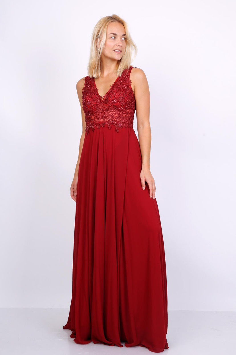 Robe cérémonie dos nu - buste dentelle et perle bordeaux