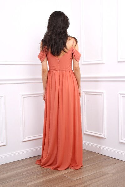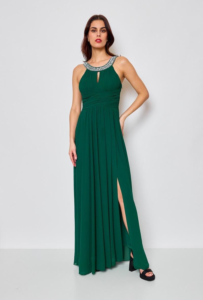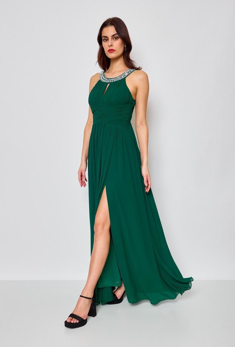 Robe de cérémonie avec fente et dos nu sauge - buste dentelle et strass